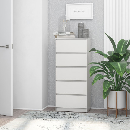 Наш интернет-магазин 'Моя Мебель' предлагает Вам недорогой высокий и узкий комод с 5-ю ящиками 'К-02' из серии СИТИ. Он имеет белый цвет и белый корпус. Этот комод идеально подходит для маленьких помещений, поскольку он имеет небольшие размеры. Он имеет 5 ящиков, которые позволяют Вам хранить все необходимые вещи и предметы. Кроме того, он имеет прочную конструкцию, которая прослужит Вам долгое время. Этот комод прекрасно дополнит любой интерьер и придаст Вашему дому или офису стиль и уют. Закажите сейчас этот современный белый комод себе в спальню, прихожую, коридор, гостиную или комнату ребёнка и мы оперативно доставим его прямо к Вашим дверям!