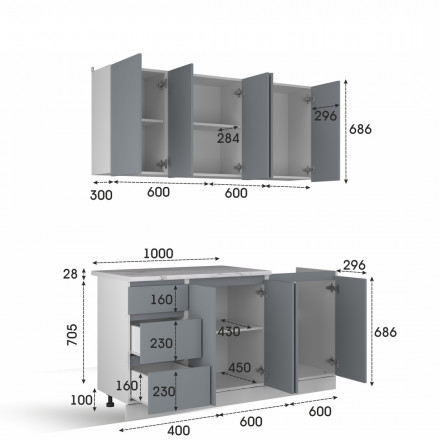 Высота нижних тумб 850 мм указана с учетом опор h-100 мм и столешницы h-28 мм.
