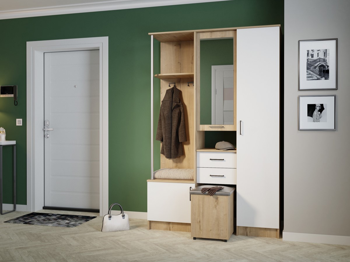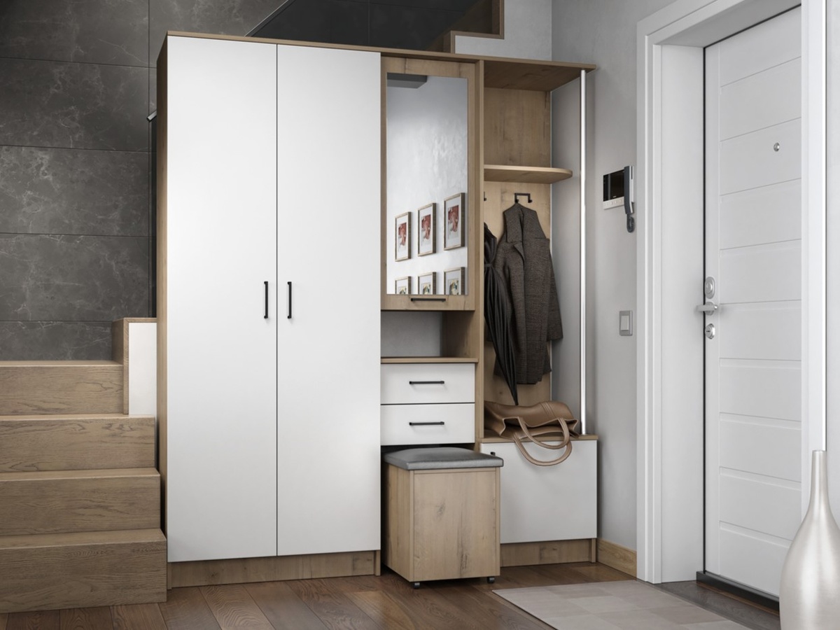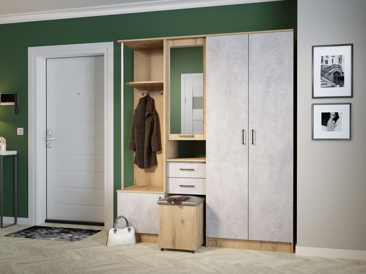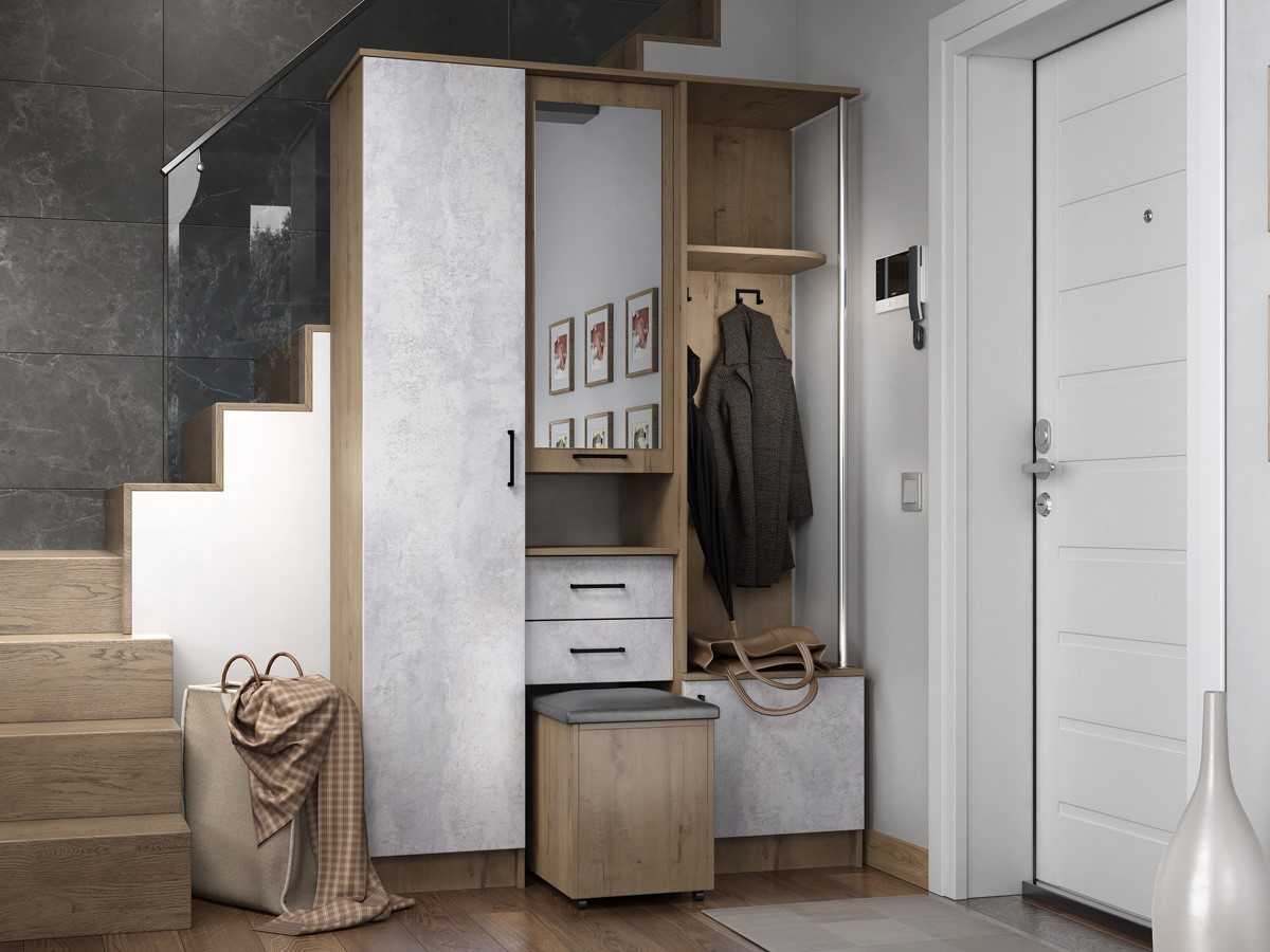 Низкая цена на популярный товар «Прихожая в коридор с зеркалом, шкафом, обувницей, вешалкой, сиденьем, полками, ящиками, тумбой и банкеткой пуфиком DYCA 130 (цемент / бунратти)» в интернет-магазине m-m-mebel.ru