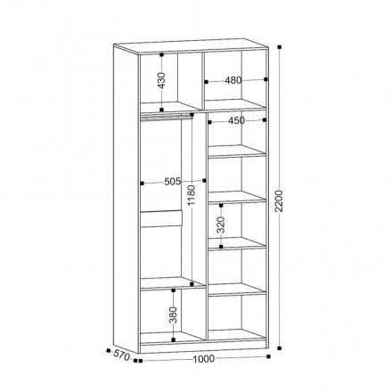 Внутреннее устройство шкафа предусматривает наличие полок, позволяющих организованно хранить одежду, аксессуары и другие предметы. Количество и расположение полок можно адаптировать под индивидуальные потребности пользователя.